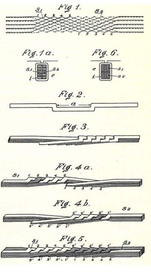 Twee foto's (1947-1949) met daarop duidelijk de basis van dit principe van Ludwig Roebel bij Willem Smit & Co's Transformatorenfabriek. In die tijd nog allemaal handwerk. Enkele jaren later werd deze tijdrovende handeling vervangen door een CTC machine bij Smit Draad.. Bron: Stichting Willem Smit Historie Nijmegen.