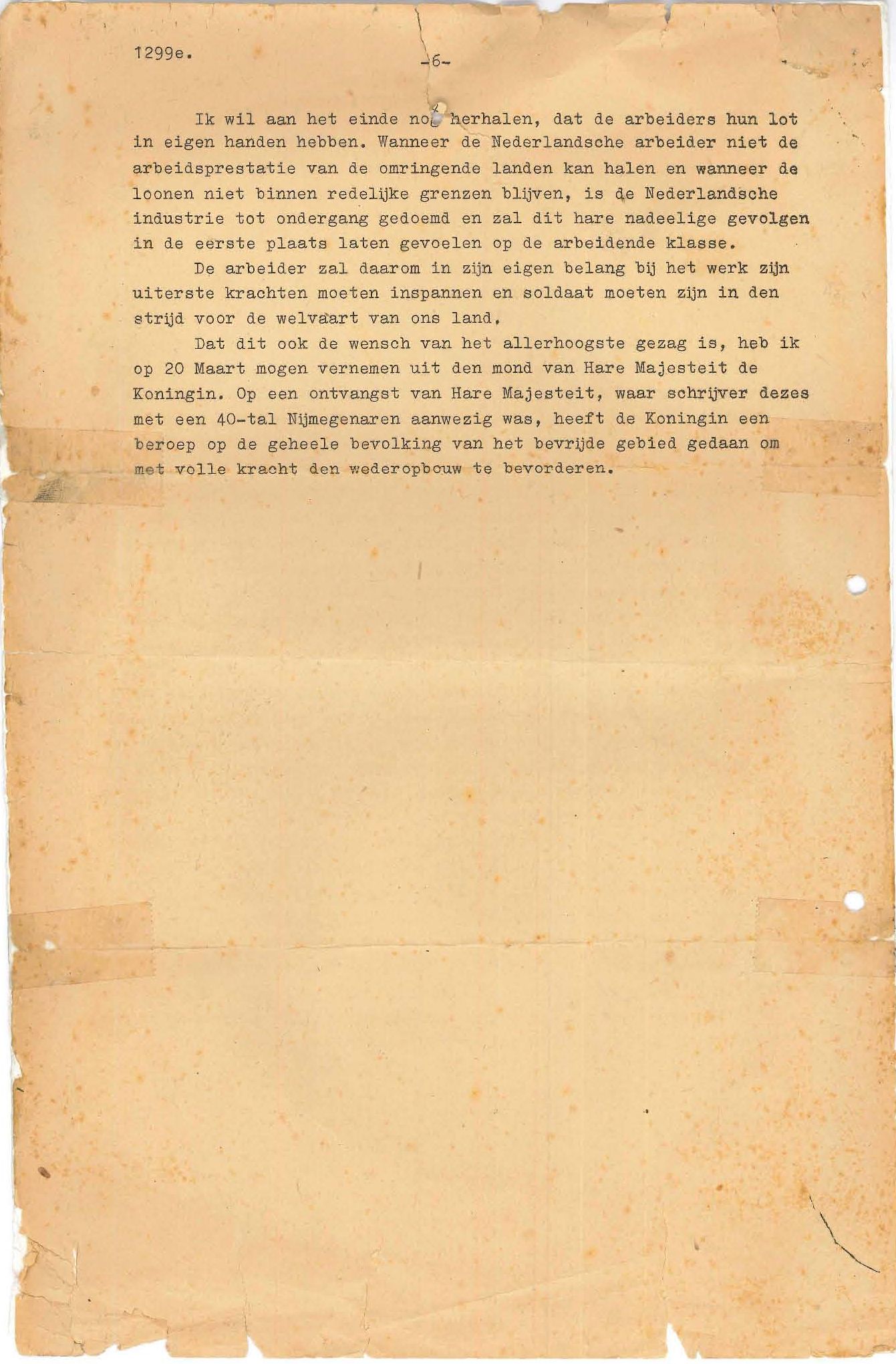 Van het Regionaal Archief in Nijmegen ontvingen wij dit unieke document dat door directeur Thomas Rosskopf in maart 1945 is geschreven aan het personeel van Smit Transformatoren. Waarschijnlijk heeft hij met deze brief het personeel toegesproken. Hij ging in op de toestand van de fabriek, de verwoestingen in Nijmegen en ook de wederopbouw en de offers die men daarvoor moet brengen. Kennelijk ging er men toen al vanuit dat de oorlog bijna afgelopen was, maar die zou toch nog 2 maanden duren.