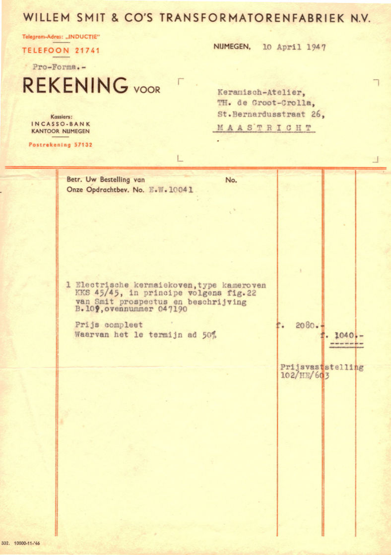 Tobias stuurde ook nog een map met documenten van de aankoop diverse ovens gekocht bij Smit. Daar zaten nog interessante brieven bij zoals een afscheidsbrief van de directeuren Rosskopf en Bergsma in 1946, meerdere facturen en orderbevestigingen, maar ook zelf gemaakte, wellicht door secretaresse Johanna Wycoff-De Wilde (getypte) handleidingen van de werking van de oven.