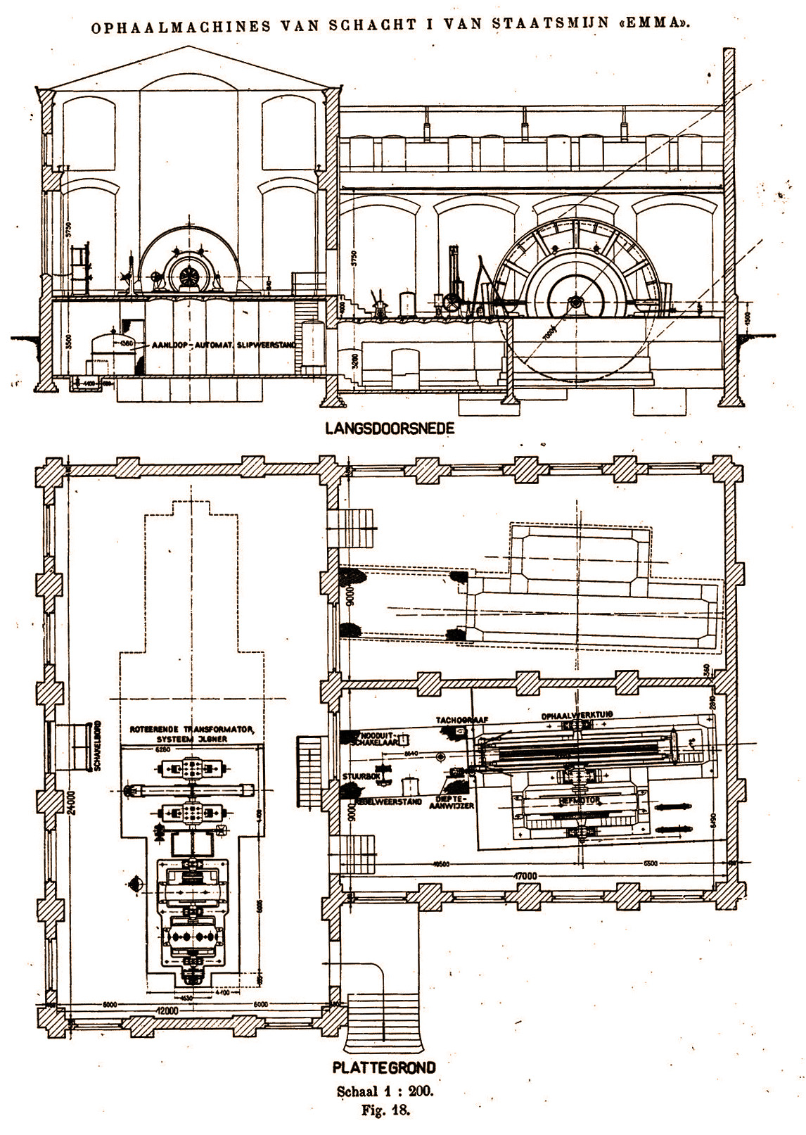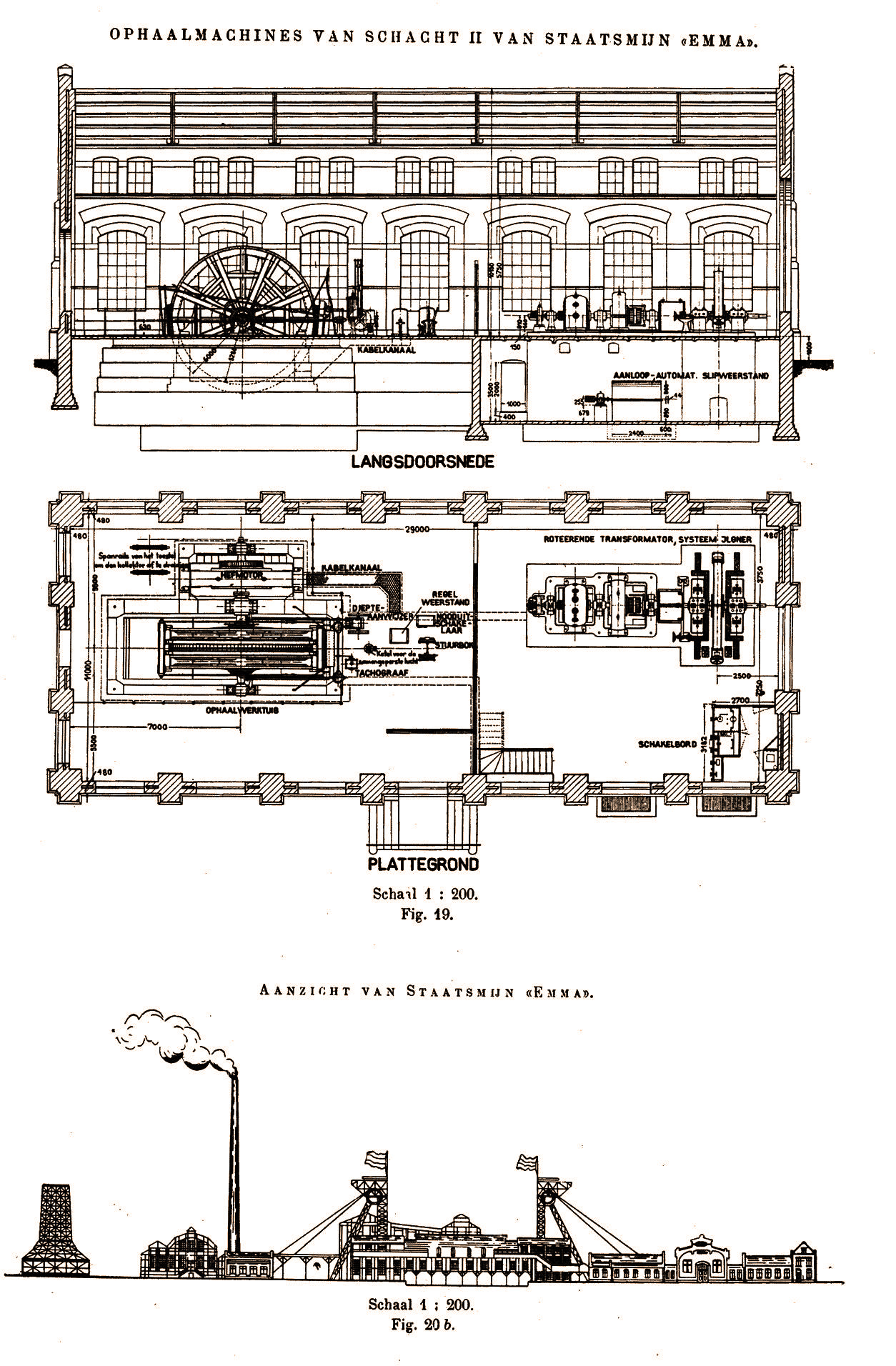Om jullie een idee te geven hoe deze ophaalmachine werkte staan hieronder 2 schema's van de staatsmijn. In dit geval staatsmijn (Emma) en enkele jaren ouder (1913) dan bovenstaande motor, maar wat betreft de techniek was er toen nog niet zoveel veranderd.