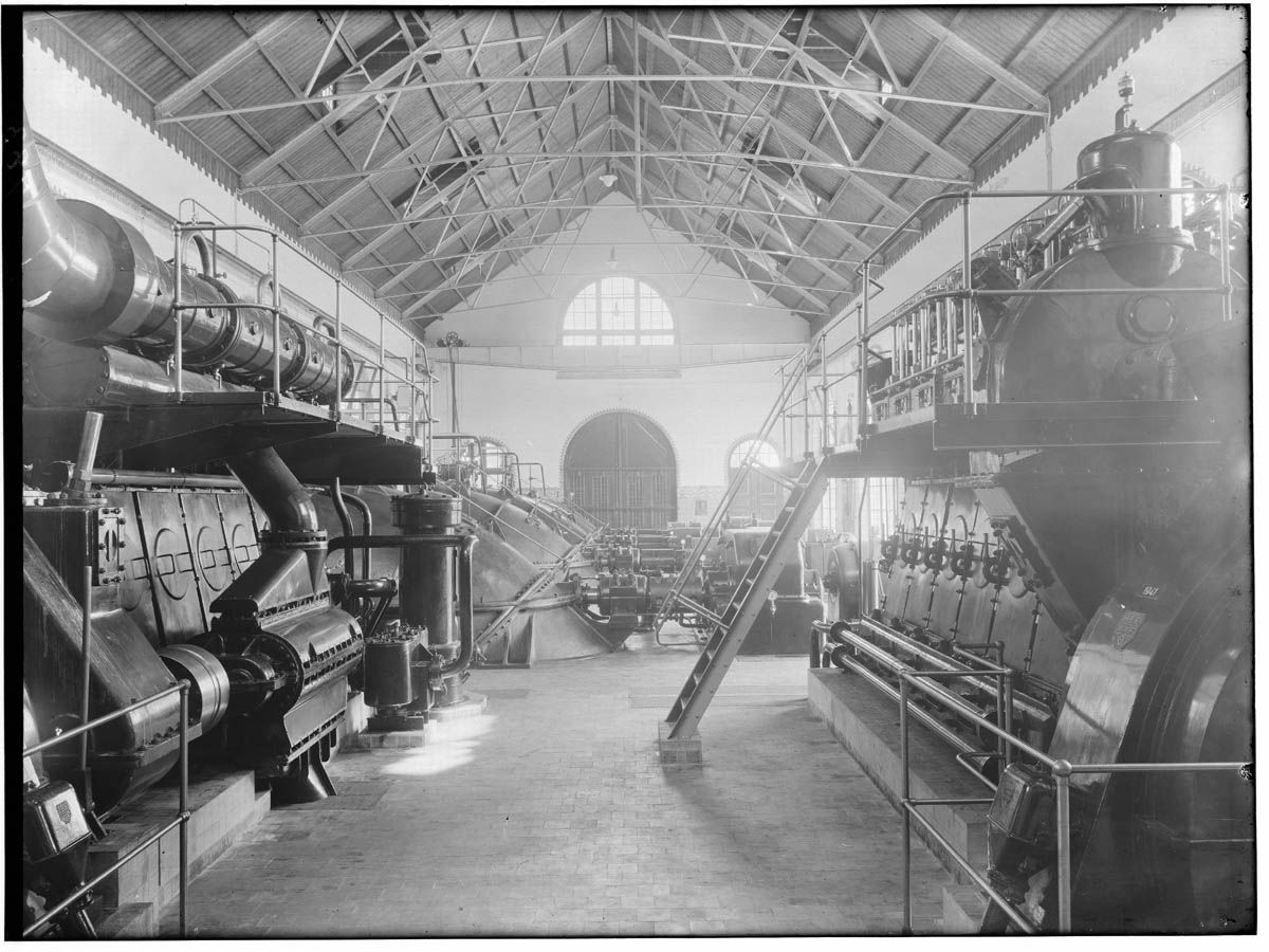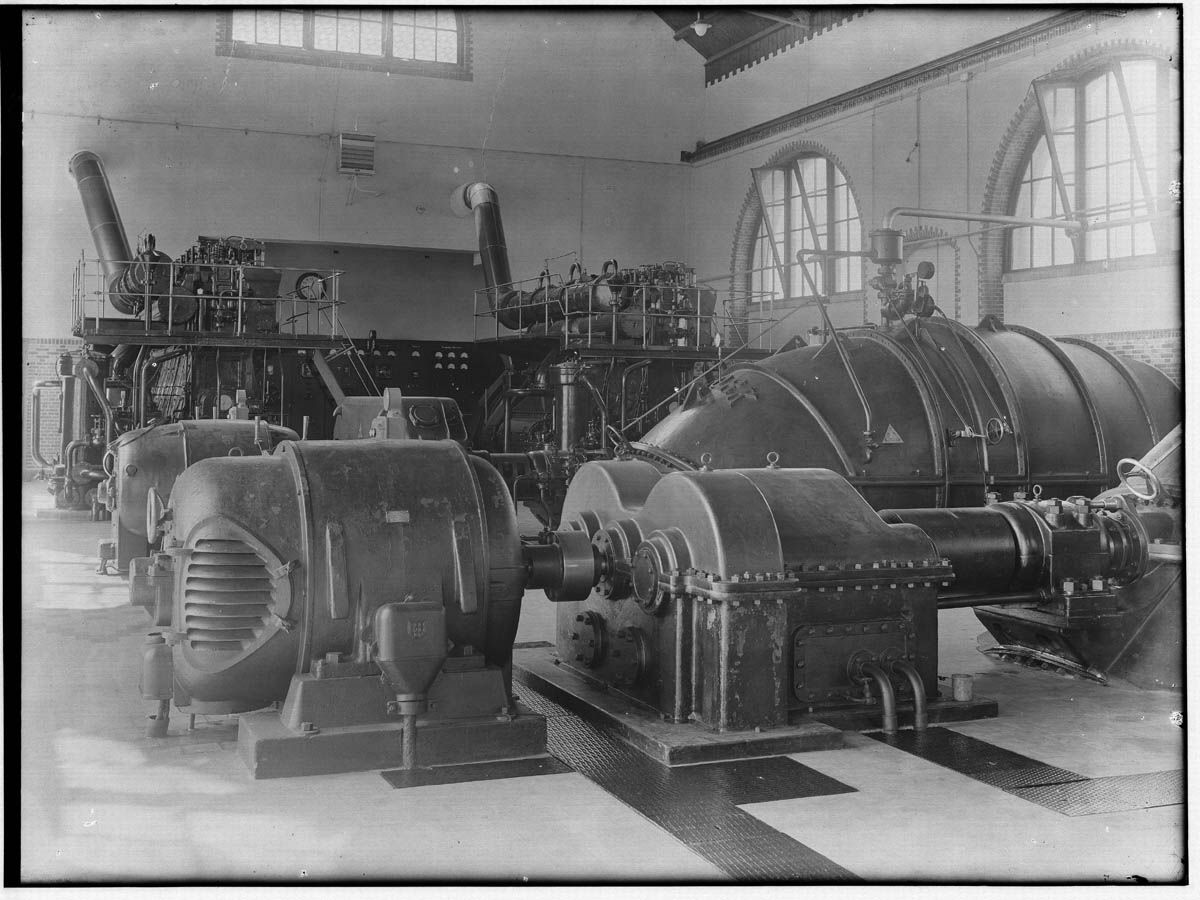 De machinekamer van gemaal Electra in 1947, geheel rechts de transformator